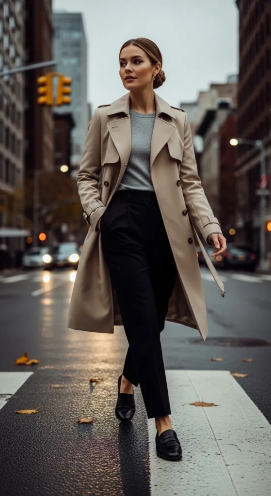 Stylist Suggestion: Wear a sleek low bun—this emphasizes the clean lines of the trench and keeps the overall look sophisticated.