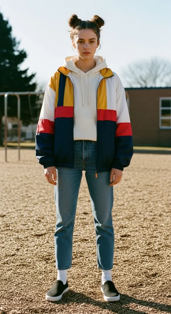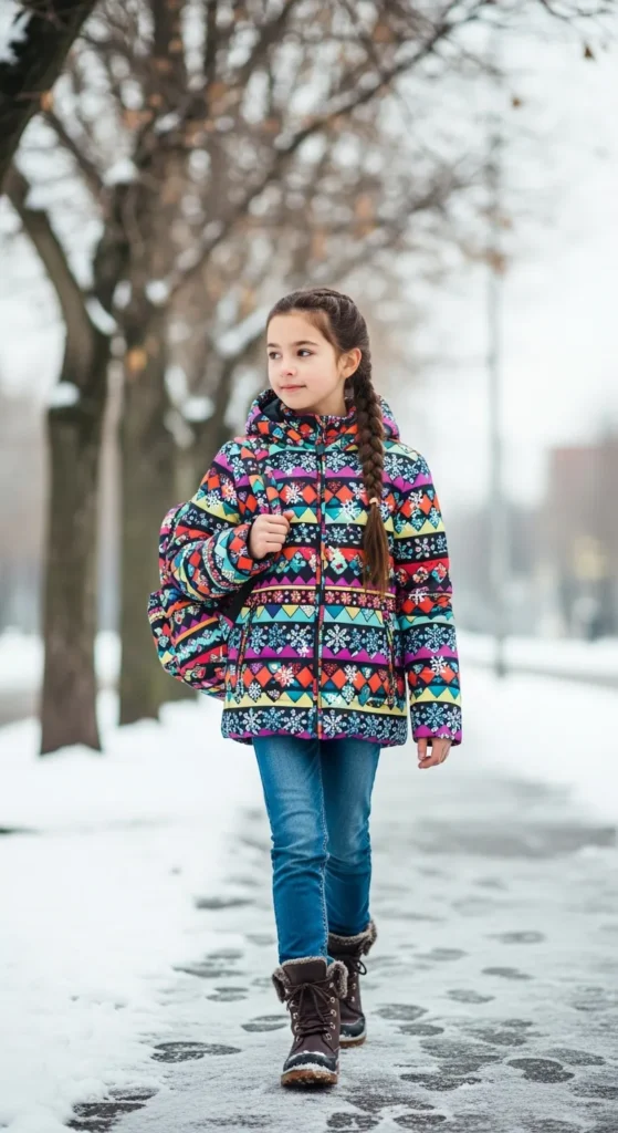 A bright color-block windbreaker over a soft hoodie brings a sporty, cheerful feel to winter school mornings. It’s warm enough for mild cold days while still letting kids move freely.