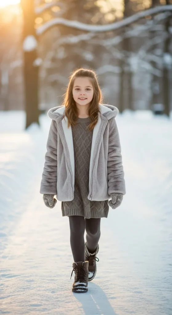 A faux-fur hood adds soft winter charm to a thick jacket layered over a cozy knit dress. It feels dressy without being fussy, perfect for picture days or special school events.