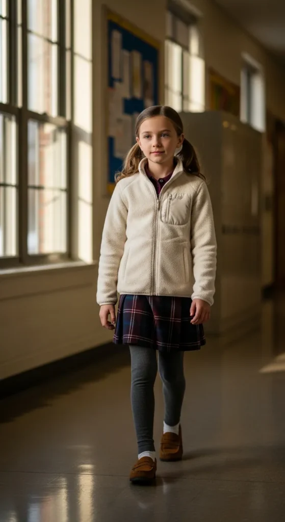 A warm fleece zip-up keeps things cozy, while a plaid skirt adds a touch of classic school style. Together, the outfit feels sweet, simple, and comfortable.