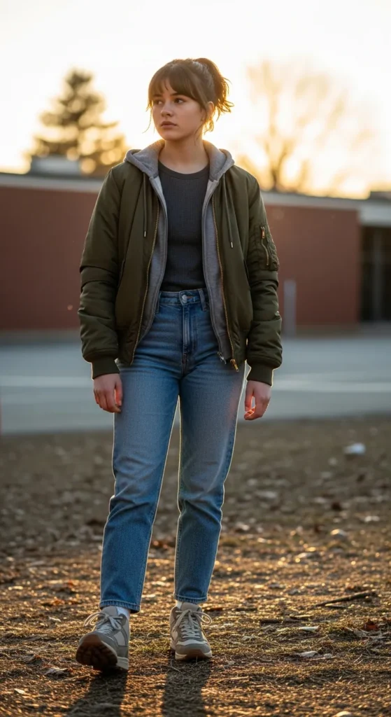 A hooded bomber jacket brings a cool, casual look perfect for school. Paired with straight jeans, it’s simple, warm, and easy to style every day.