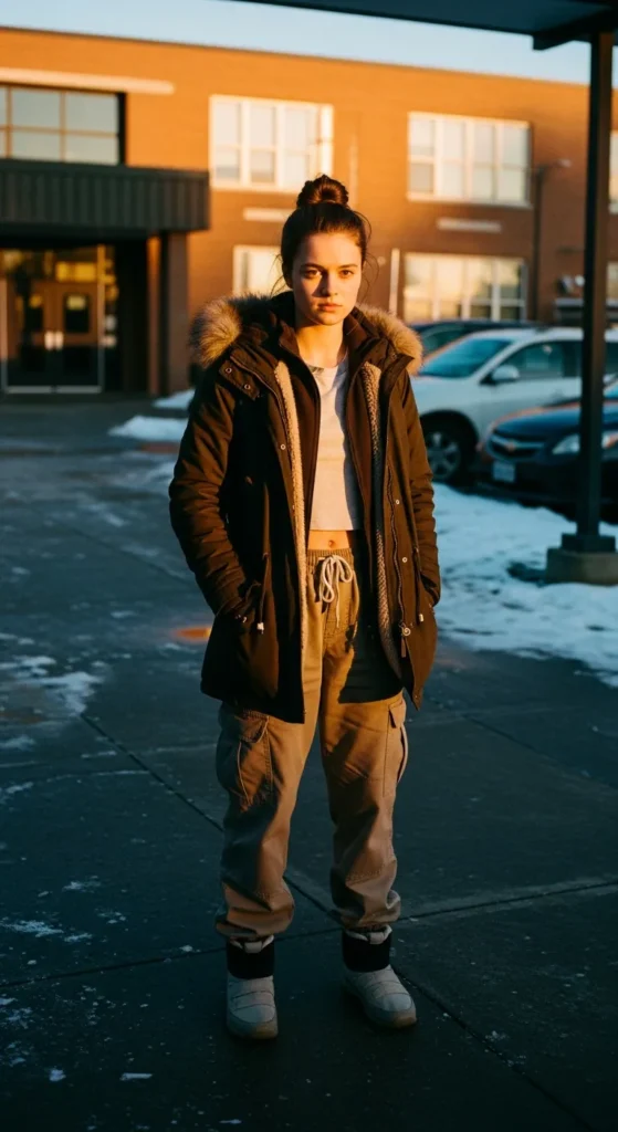 A hooded parka gives structure while cargo joggers add practicality. It’s comfortable, durable, and perfect for active school days.