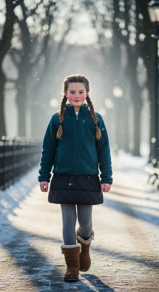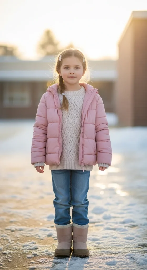 A soft pastel puffer with a chunky knit sweater creates the sweetest winter school look. It keeps the outfit light, playful, and warm without ever feeling heavy. Perfect for chilly mornings when comfort matters most.