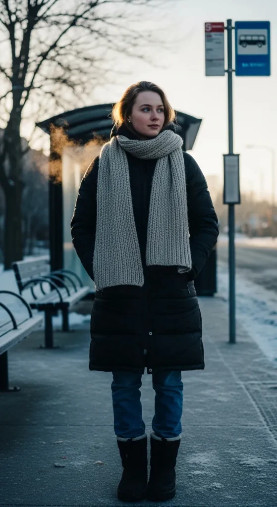 A longline puffer feels extra warm and cozy for colder days. The chunky scarf gives the outfit that soft winter look that feels both comfy and polished.