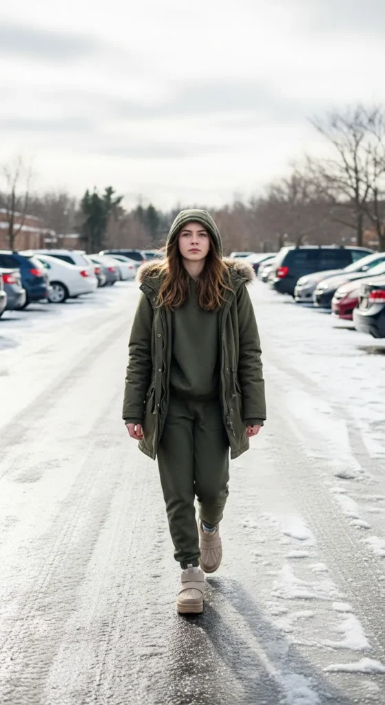 A warm parka over a matching sweats set blends comfort with everyday school practicality. It feels cozy but still neat and balanced.
