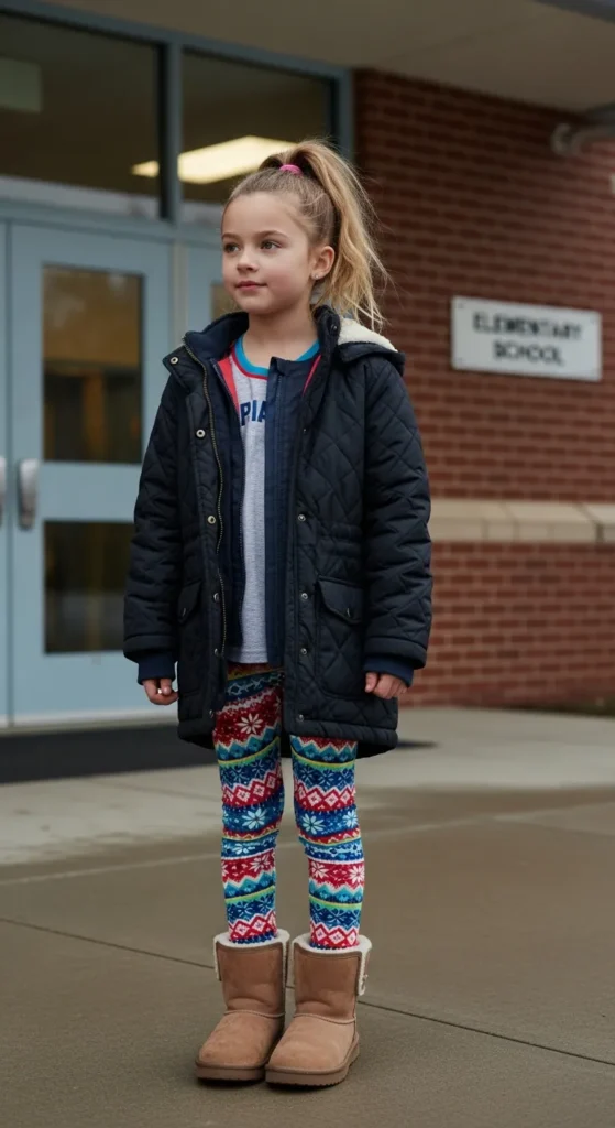 A quilted parka feels protective and warm without looking bulky. Pairing it with soft leggings keeps the outfit flexible and easy for busy school days filled with movement.