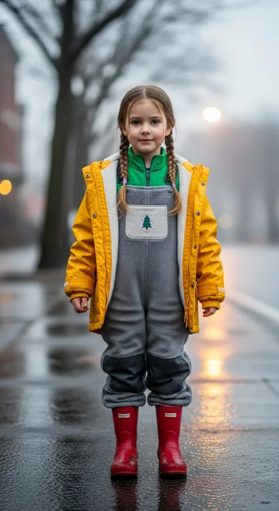 A rainproof jacket keeps kids dry on wet winter days, while warm overalls give the look a playful, childhood charm.