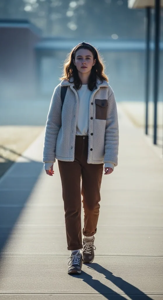 A fluffy sherpa jacket brings a cuddly feel to a school outfit while corduroy pants keep it grounded and sturdy. It’s the perfect mix of warm textures that feel fun and wintery.
