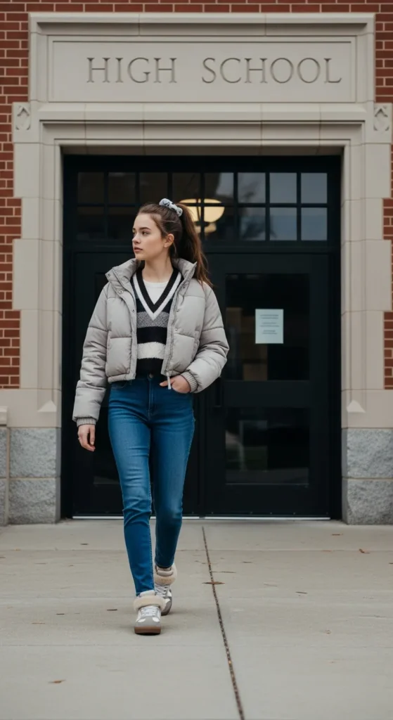 A short puffer keeps things light, while a sweater vest layered over a long-sleeve tee adds warmth and charm. It’s cute, layered, and easy for school days.