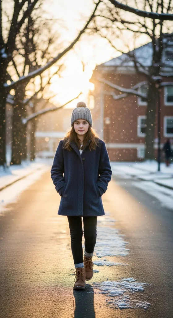 A soft wool coat feels a little more grown-up but still cozy and sweet for school. Adding a knit beanie gives the look warmth and playfulness.