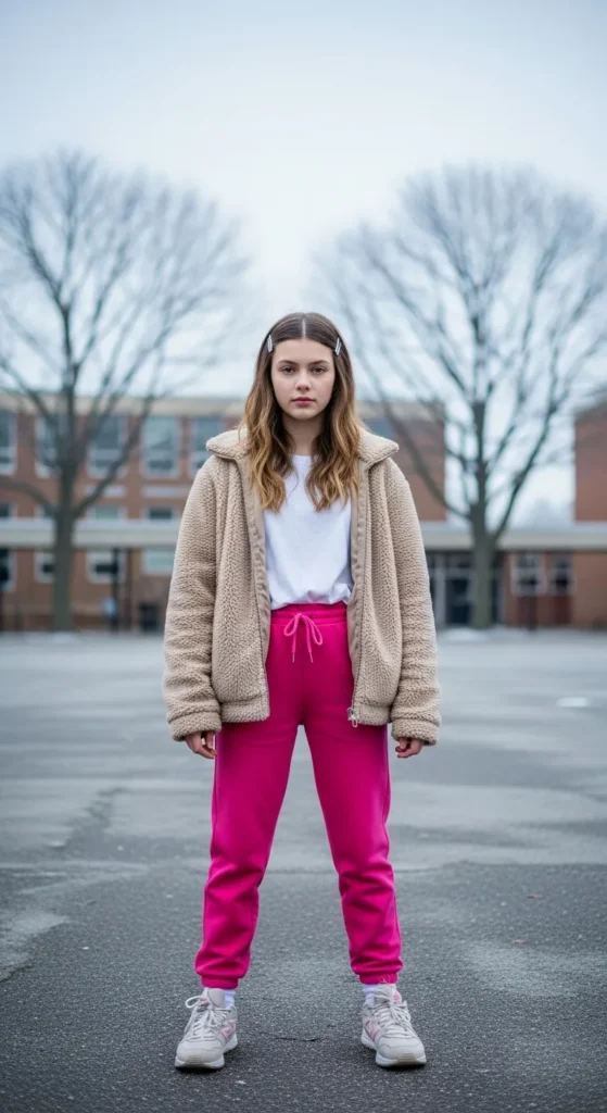 A teddy jacket feels like wearing a cloud. Paired with bright joggers, this outfit turns a winter day into something playful and full of energy.