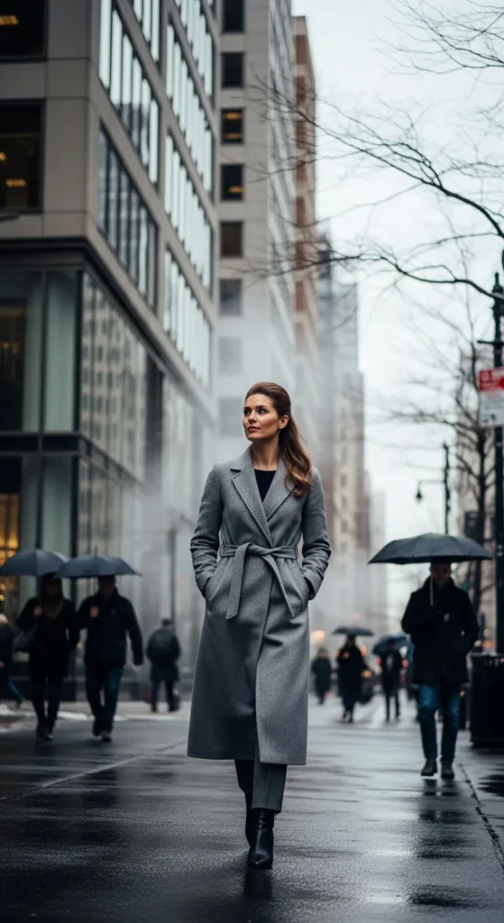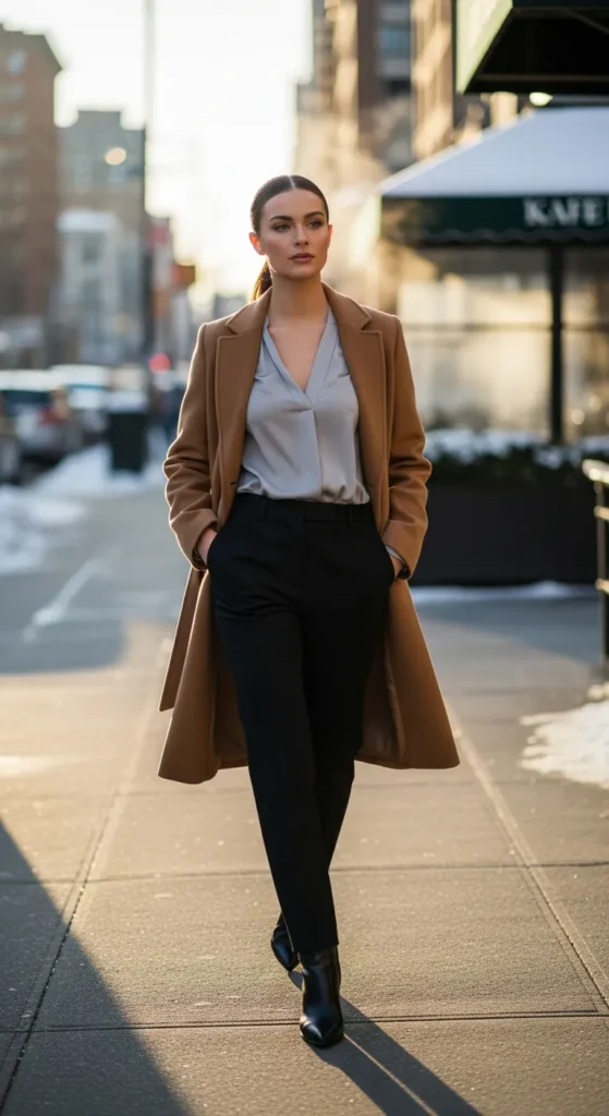 A belted coat instantly elevates simple office separates underneath. It creates shape, confidence, and an effortlessly put-together feel even on rushed winter mornings.