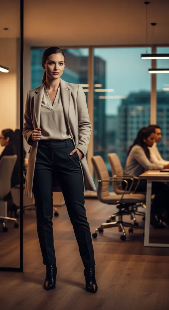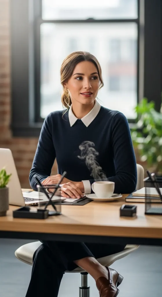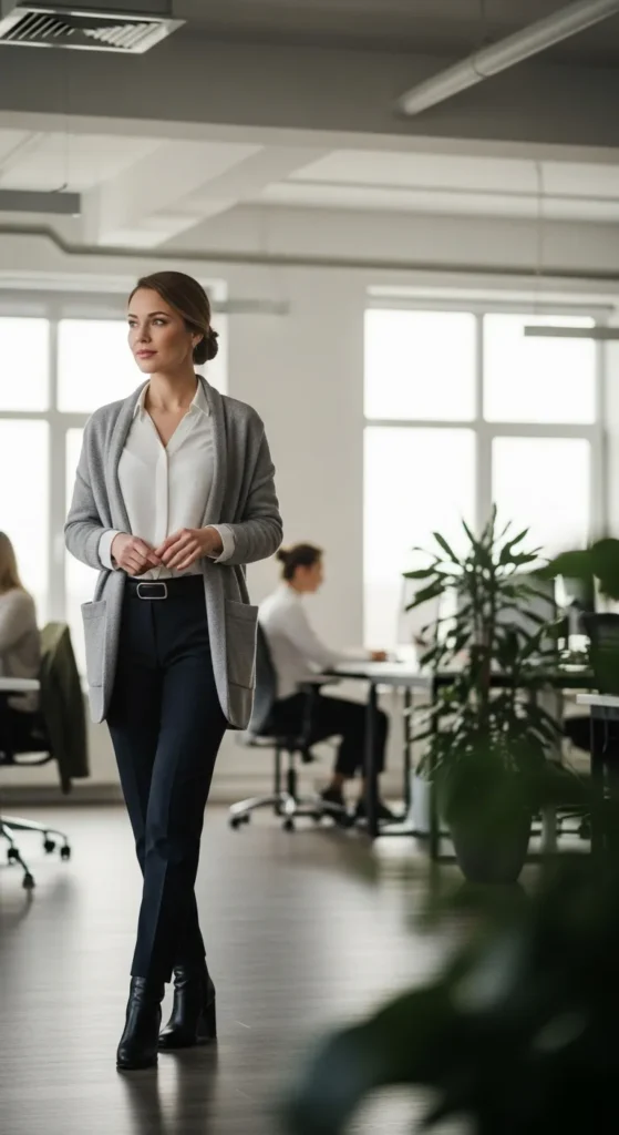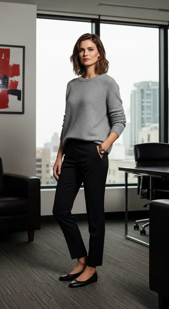 A relaxed knit sweater paired with tailored pants offers comfort without sacrificing professionalism. It’s perfect for long office hours when you want to feel calm, capable, and quietly stylish.