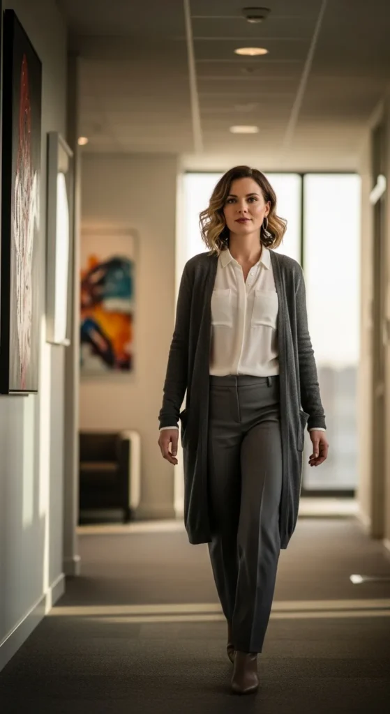 A cozy longline cardigan layered over a crisp button-down feels approachable yet work-ready. This outfit moves beautifully through chilly offices and coffee breaks, giving comfort without losing structure or intention.