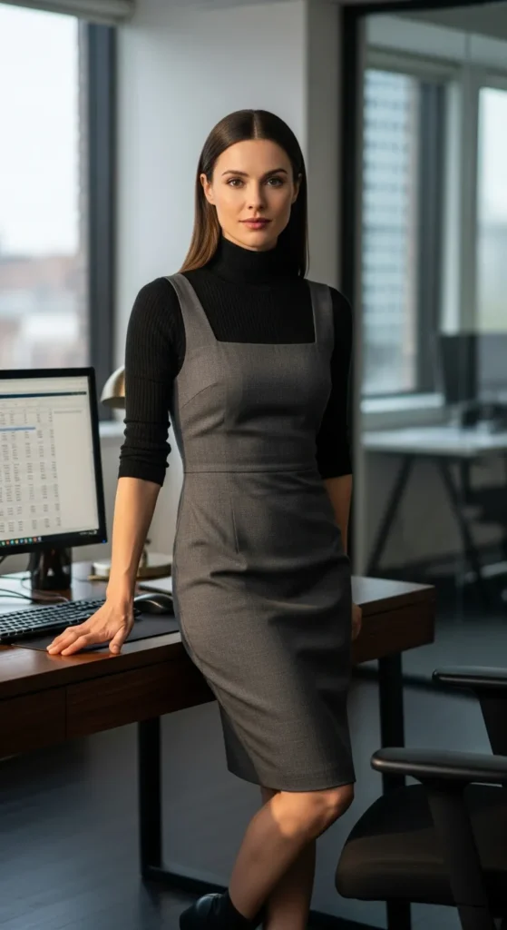 Layering a thin turtleneck under a tailored dress adds warmth while keeping lines clean. It feels intentional, smart, and quietly creative—perfect for winter workdays that demand polish.