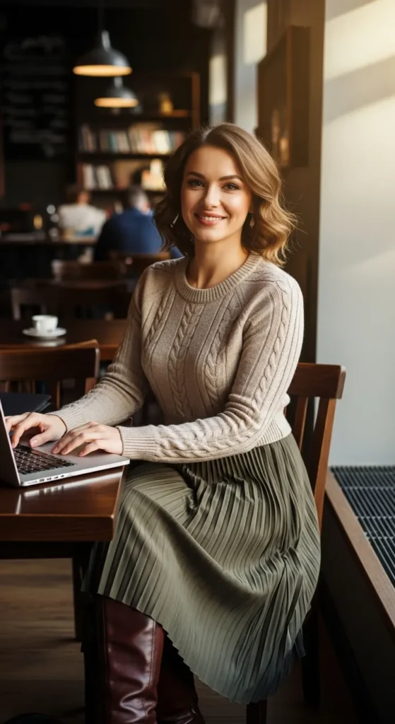 A structured sweater tucked into a midi skirt creates movement and warmth. This outfit feels feminine yet grounded, ideal for creative offices or days when confidence needs a softer expression.
