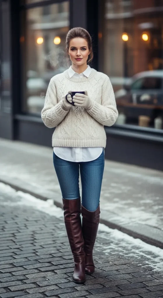 A crisp button-down layered under a knit creates visual interest and polish, while knee-high boots keep the outfit grounded and winter-ready.