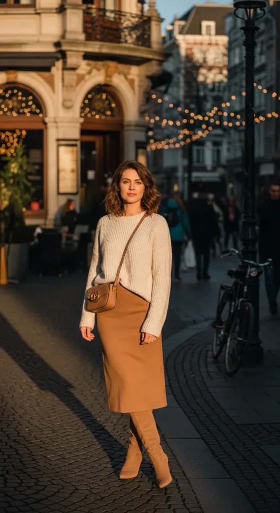 An oversized sweater tucked into a structured midi skirt feels relaxed yet intentional, with knee-high boots grounding the softness. It’s cozy, feminine, and perfect for slow winter days.
