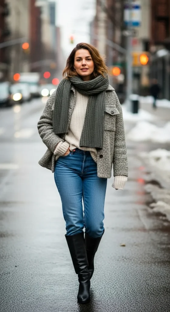 Stylist Suggestion: Add a textured scarf in a neutral tone, it draws attention upward and adds dimension without overpowering the simplicity of denim and boots.