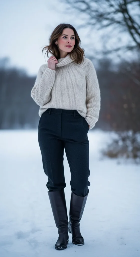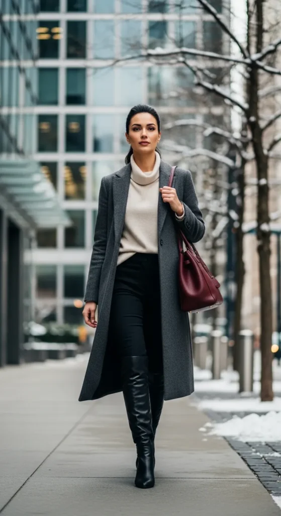 Clean layers with knee-high boots create a professional winter outfit that still feels comfortable. It’s structured enough for work but never stiff.