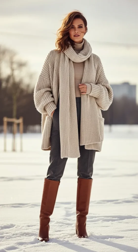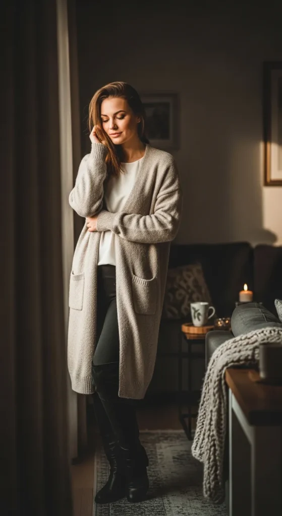 A long cardigan layered over simple basics feels warm and relaxed, while knee-high boots add polish and structure. It’s the kind of outfit that feels effortless but intentional.