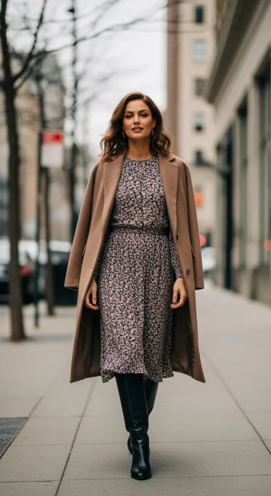 A lightweight midi dress becomes winter-ready when paired with knee-high boots and warm layers. The contrast feels feminine and practical without sacrificing style.