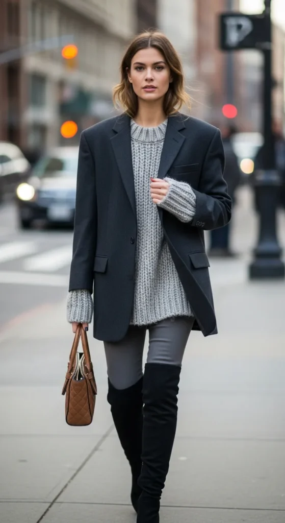 A relaxed-fit blazer over knit layers paired with knee-high boots feels modern and wearable. This outfit blends casual comfort with subtle structure for everyday winter style.