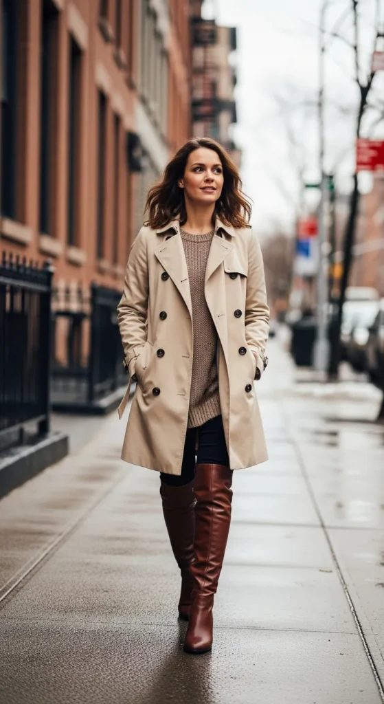 A trench coat layered over winter basics paired with knee-high boots feels effortless and chic. It’s classic without feeling outdated or overly formal.