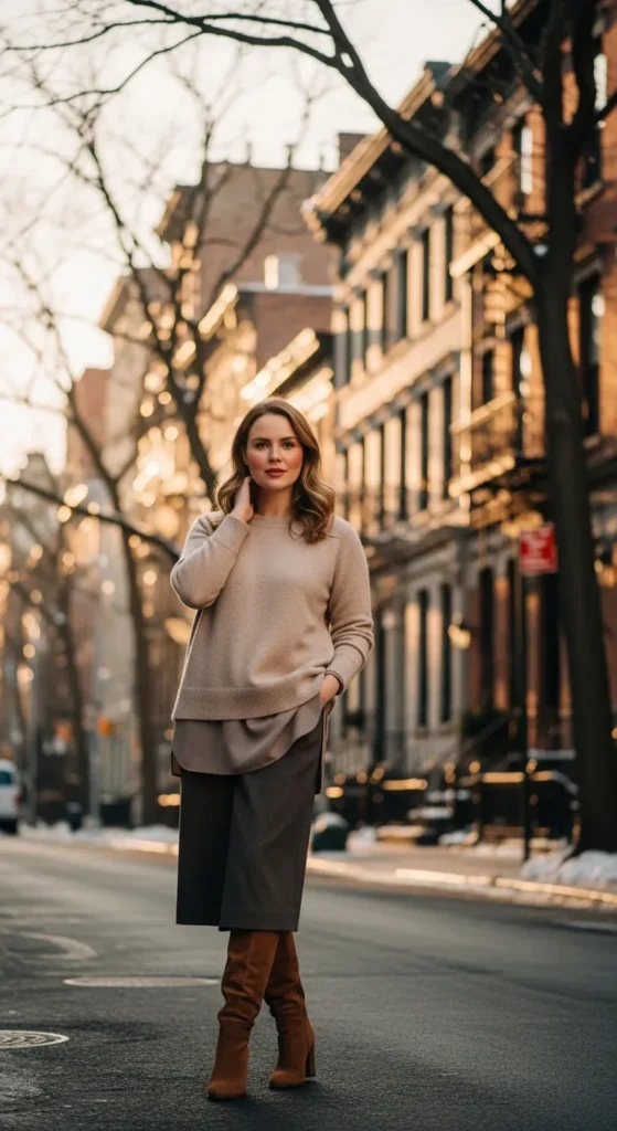 A longline sweater worn with slim bottoms and knee-high boots feels cozy yet flattering. It’s easy, warm, and quietly stylish.