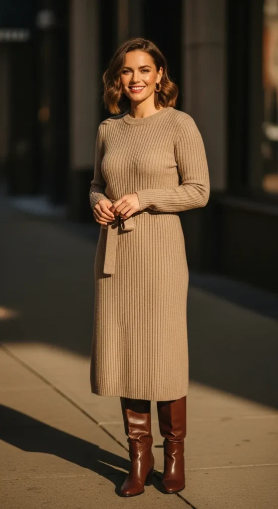 A belted sweater dress paired with knee-high boots creates instant elegance with minimal effort. It’s flattering, warm, and perfect for days when you want to look put together fast.