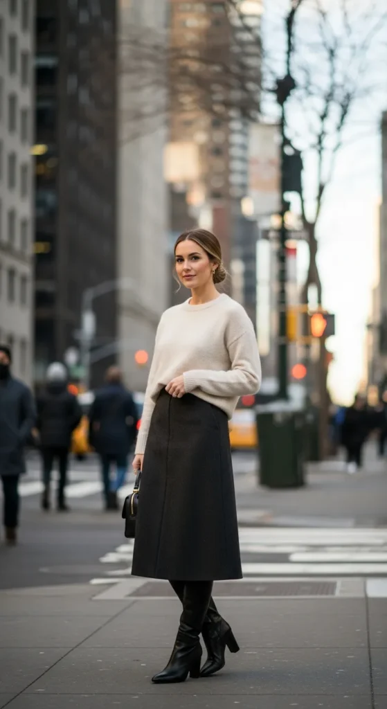 A structured skirt paired with soft winter layers creates a flattering contrast, while knee-high boots anchor the look with confidence and polish.