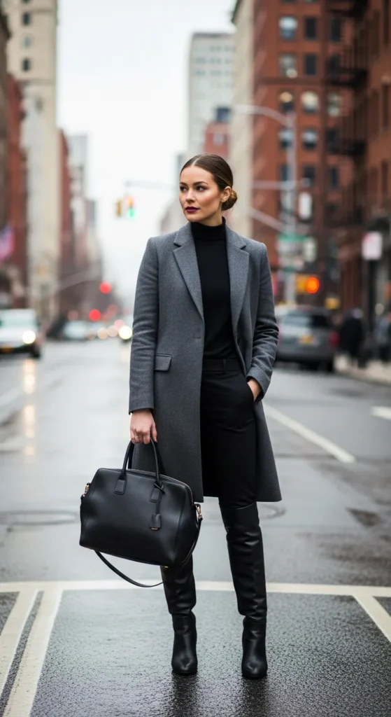 A sharp tailored coat worn over simple layers instantly elevates knee-high boots into a polished winter statement. This look feels powerful without being loud, perfect for everyday sophistication.