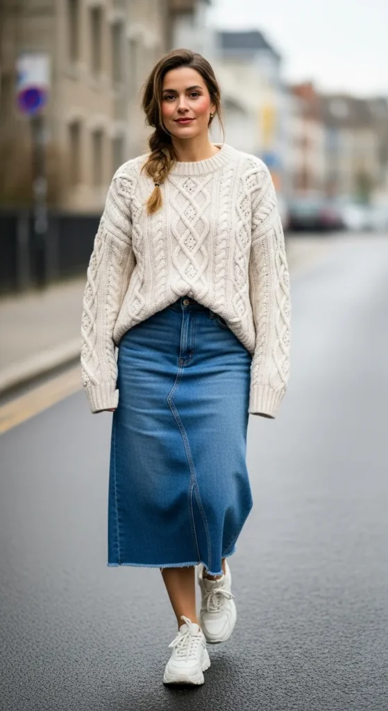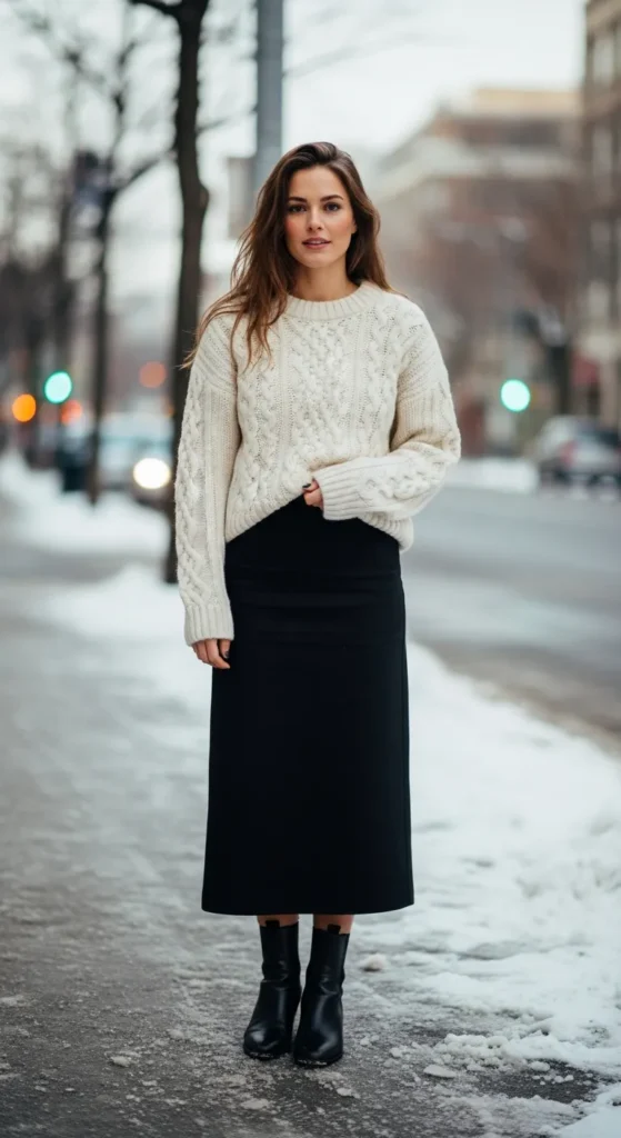 A cable knit sweater styled with a straight skirt creates a clean, winter-friendly look. It’s warm, simple, and perfect for everyday wear without overthinking.