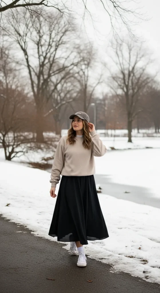 A fleece sweatshirt with a midi skirt brings ultimate comfort into winter style. It’s relaxed, warm, and perfect for off-duty days that still need a little effort.