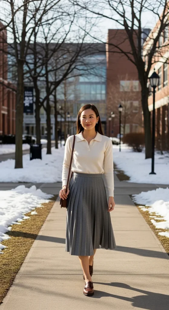 A knit polo styled with a pleated skirt feels fresh and youthful. It’s warm enough for winter while still feeling light and easy to move in.
