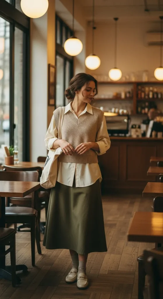 Layering a knit vest over a crisp shirt with a midi skirt feels smart and cozy at the same time. It’s perfect for days when you want structure without feeling stiff.