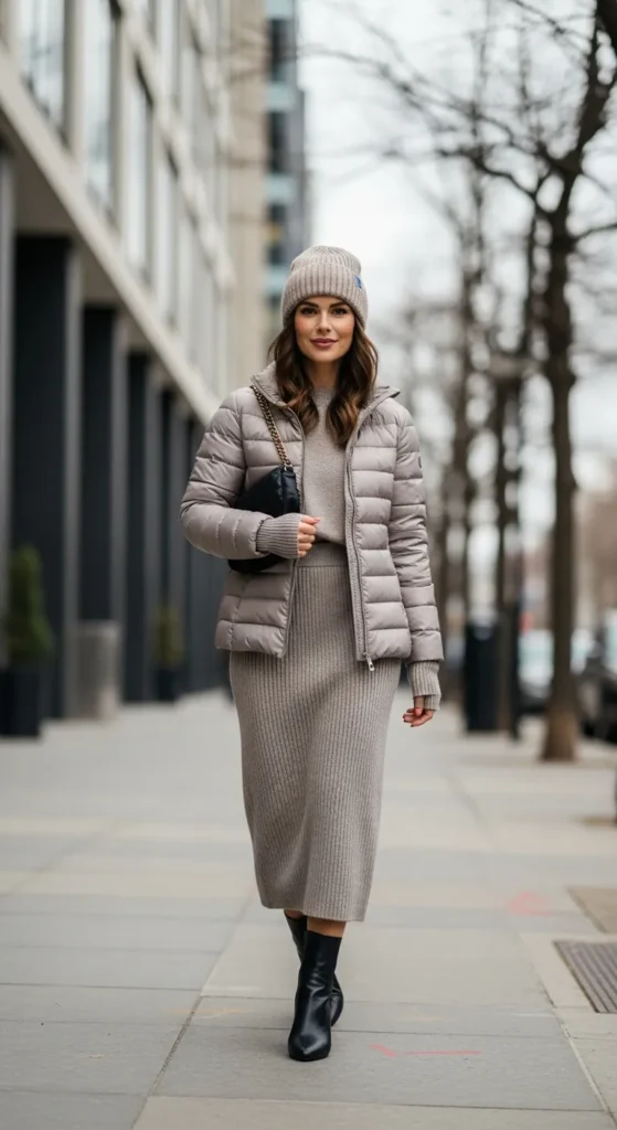 A lightweight puffer jacket layered over a midi skirt feels practical and stylish. It’s perfect for colder days when warmth matters just as much as looking good.