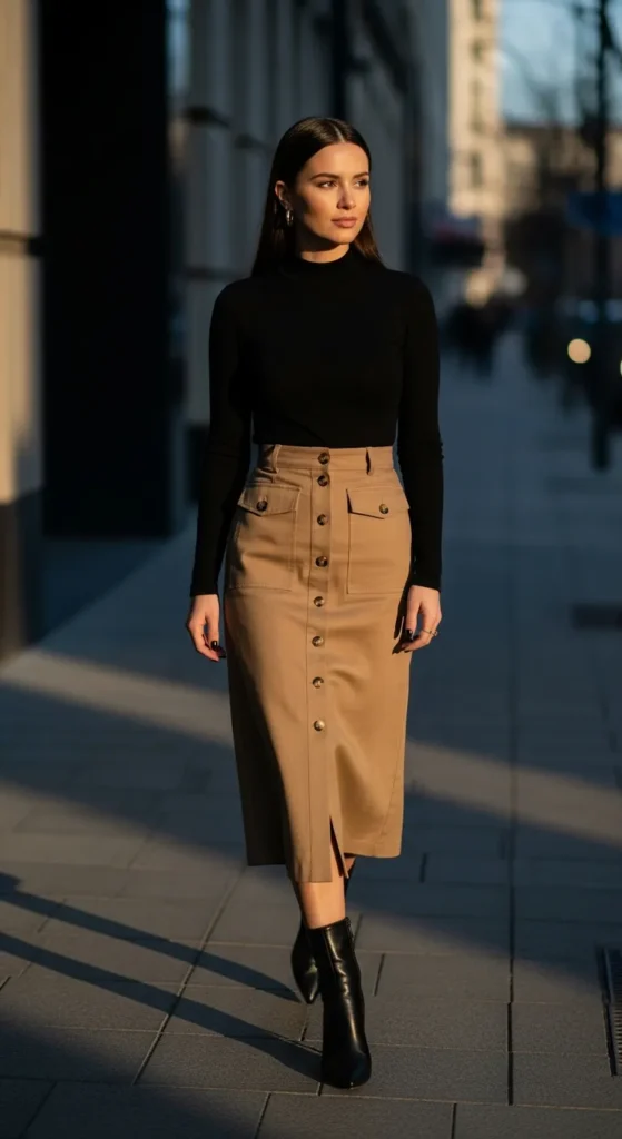 A mock neck top tucked into a button-front skirt feels sleek and warm without layering too much. It’s a clean winter outfit that works for busy days and casual meetups.