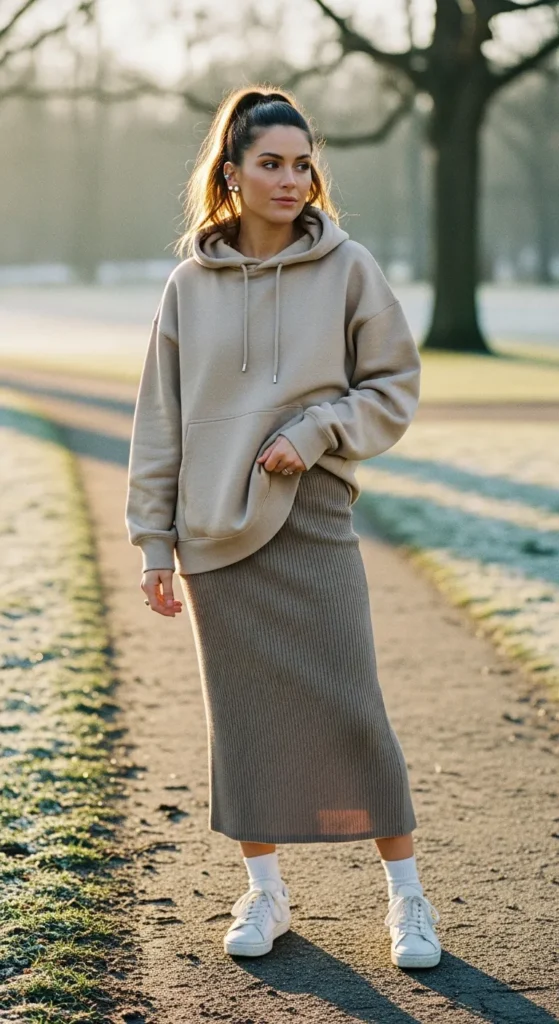 3. Oversized Hoodie With Ribbed Midi Skirt