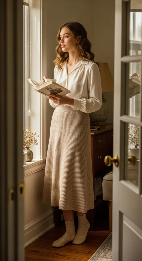 A relaxed blouse tucked into a knit skirt blends softness and warmth beautifully. It’s an easy winter outfit that feels gentle, wearable, and perfect for slower days.