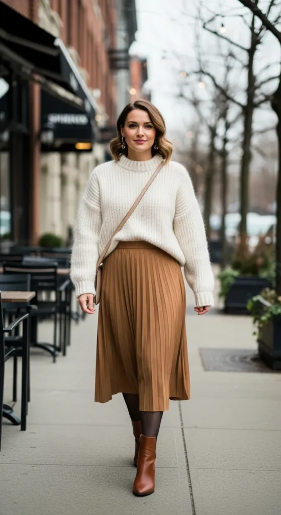 A chunky knit sweater tucked slightly into a flowy pleated midi skirt feels cozy yet polished. The contrast between soft knits and movement makes this outfit perfect for slow winter mornings and casual city walks.