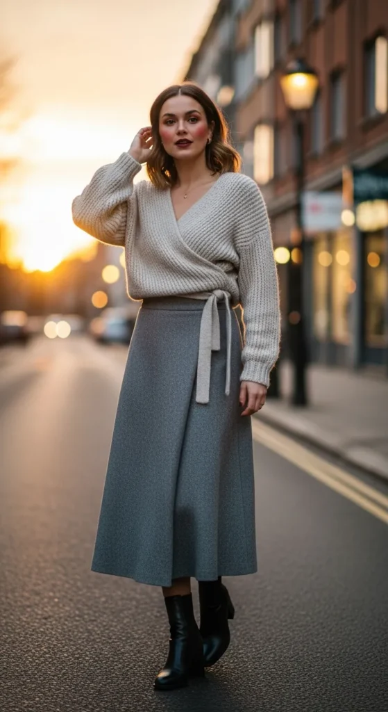 A slouchy knit sweater paired with a faux wrap skirt feels cozy and slightly playful. The wrap detail adds interest while keeping everything comfortable and winter-appropriate.