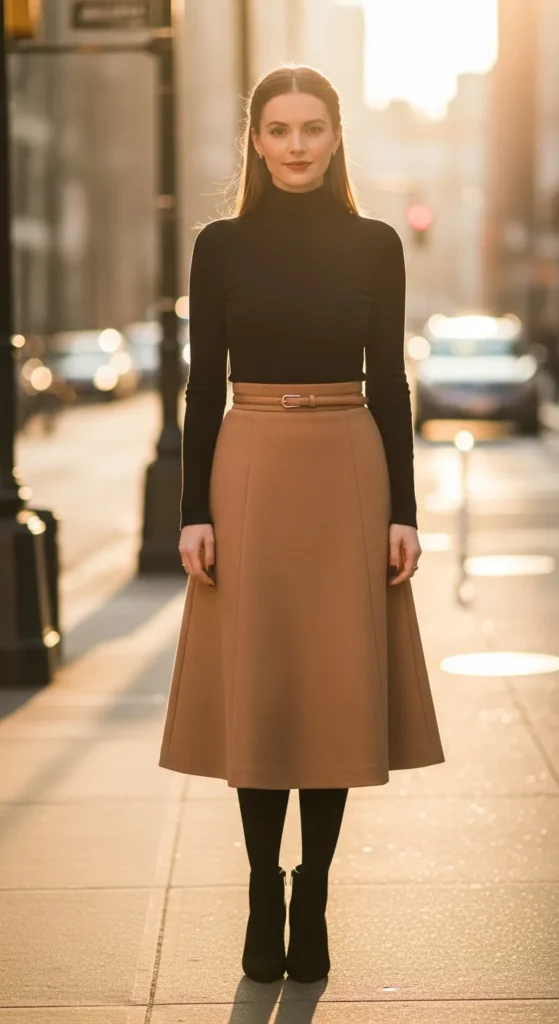 A fitted turtleneck tucked into an A-line skirt creates a timeless winter shape that always feels flattering. It’s simple, warm, and easy to dress up or down for everyday plans.