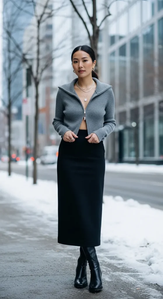 A zip-up knit top styled with a straight midi skirt feels modern and practical. It’s one of those outfits that looks simple but feels quietly confident and warm.