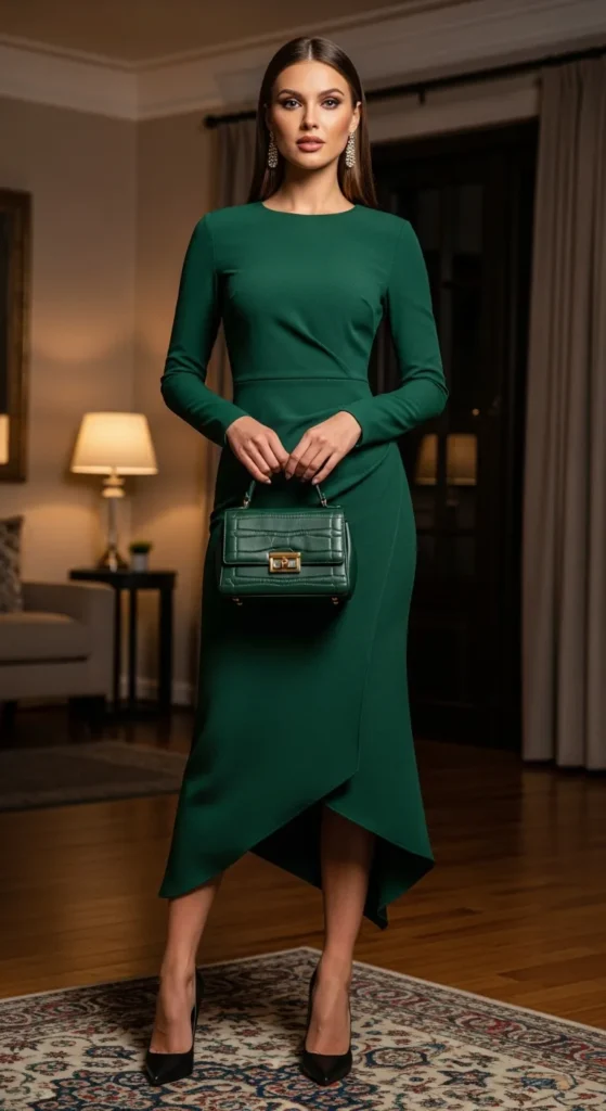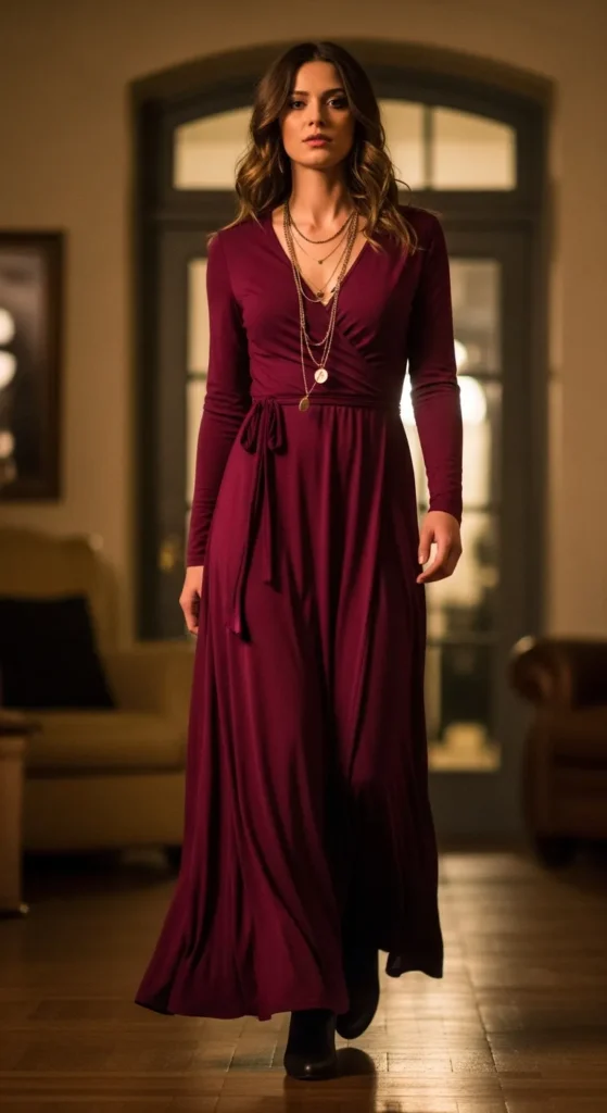A wrap-style maxi dress brings drama through movement rather than sparkle. It flows beautifully with every step, making it perfect for elegant winter nights.