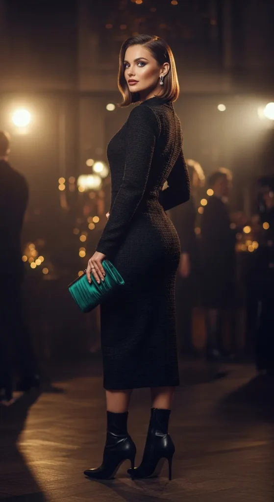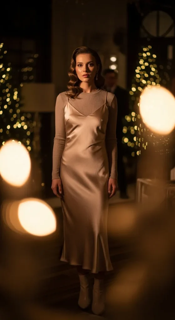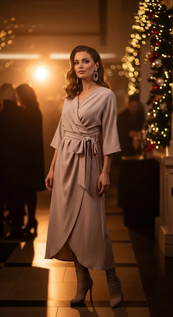 A neutral-toned dress becomes party-ready when styled with bold accessories. It’s understated, elegant, and incredibly versatile for winter nights.