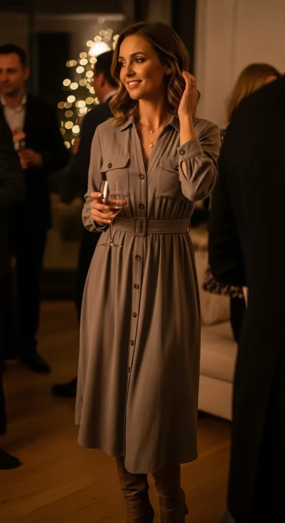 A sweater dress styled with intention becomes party-ready instantly. Warm, flattering, and effortlessly chic, it’s ideal for casual-glam winter gatherings.