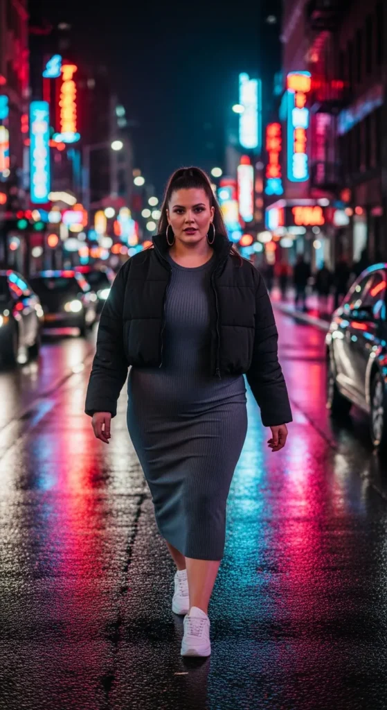Because warmth and style can coexist. A cropped puffer layered over a sleek midi dress brings a cool-girl edge to any winter gathering.