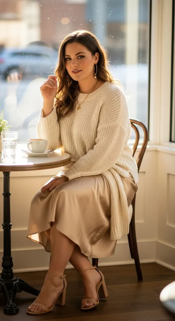 This pairing balances luxe and laid-back — a silky satin skirt paired with a cozy oversized knit sweater feels equal parts elegant and approachable.