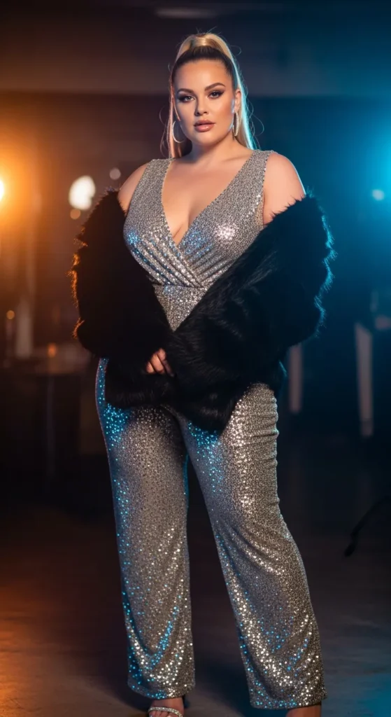 2. Sequin Jumpsuit with a Faux Fur Stole